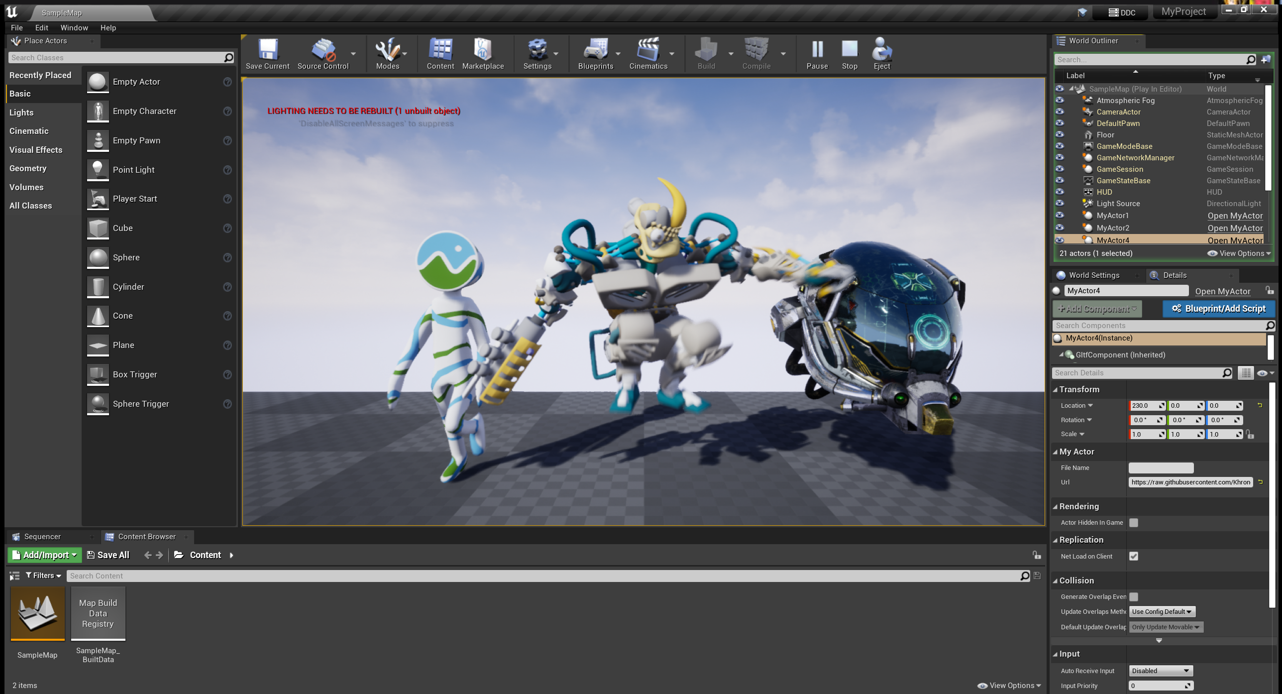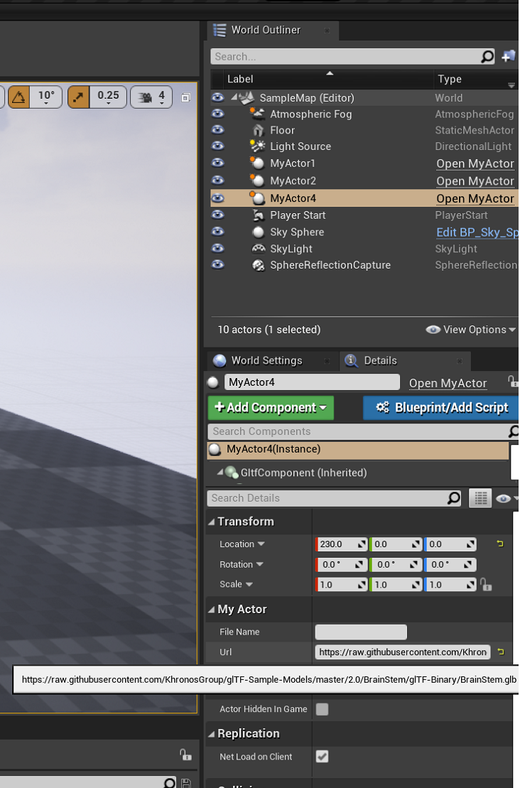 아래는 이 프로젝트에서 여러개의 MyActor에 glTF File을 로컬 파일 또는 URL로 지정해서 실행한 화면입니다.